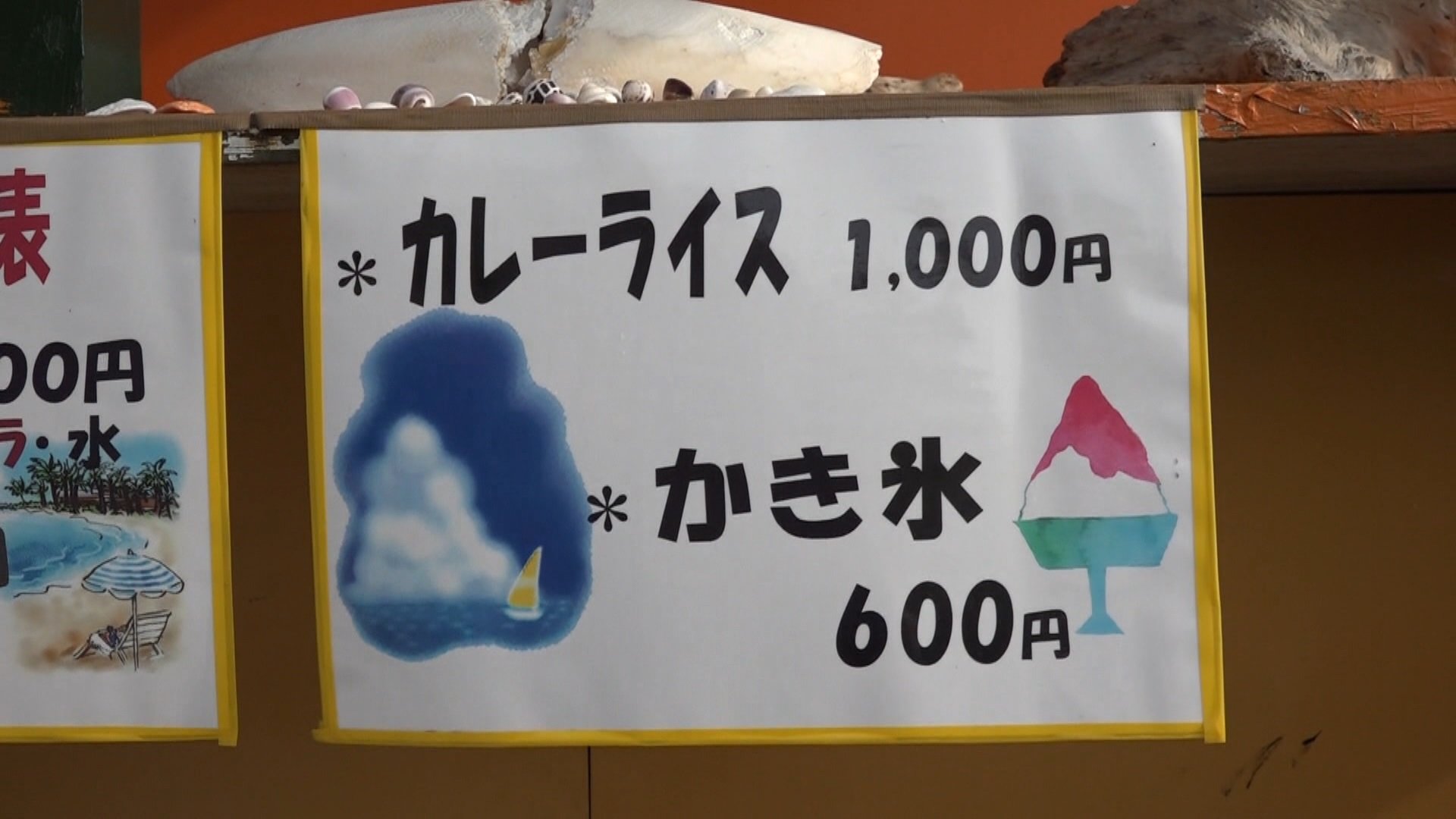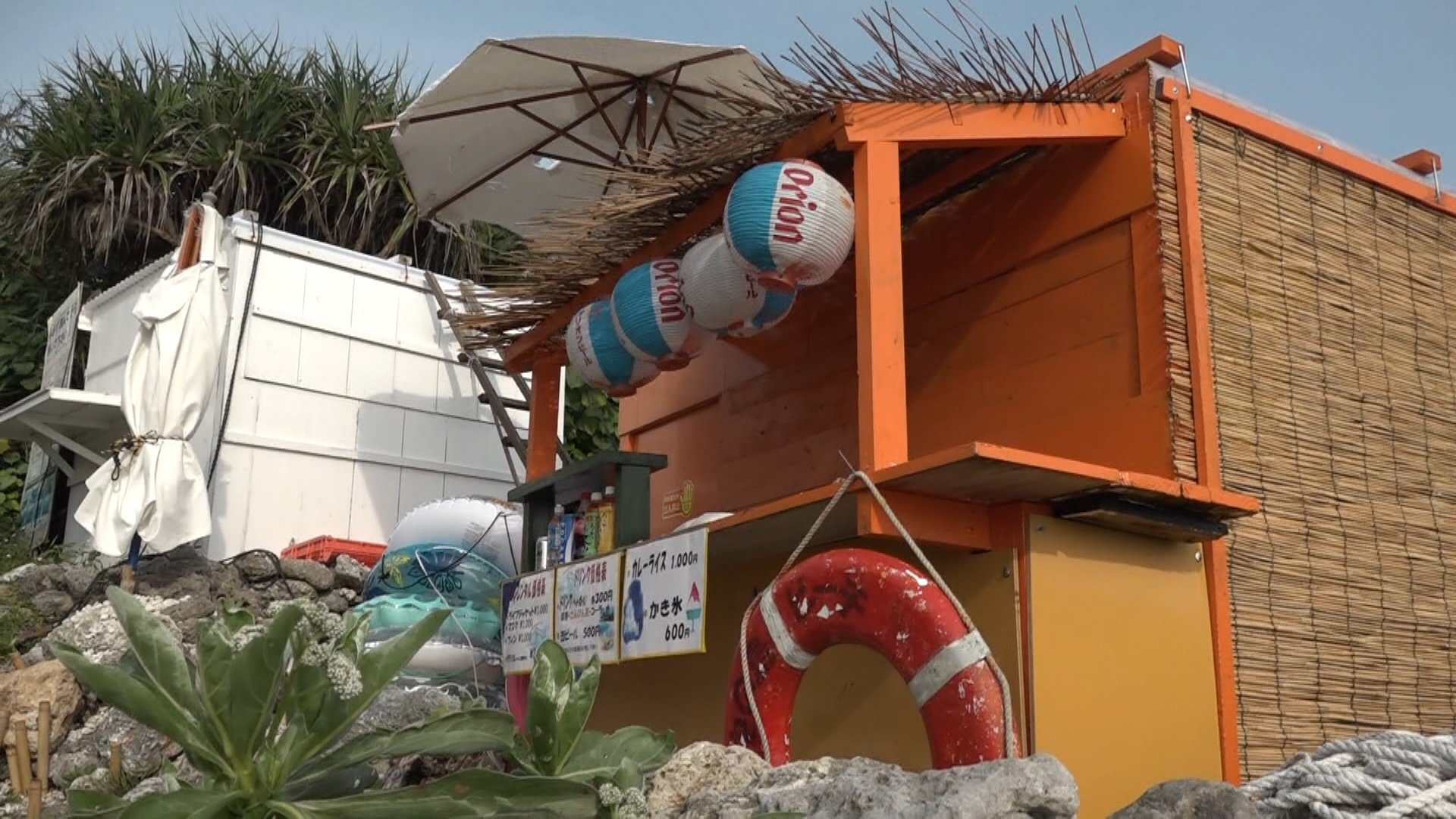 小屋の前には、浮き輪やフィンが置かれ、アルコールやジュース類も置かれています。そしてマリングッズのレンタル料金表。カレーライス1000円とも書かれています。