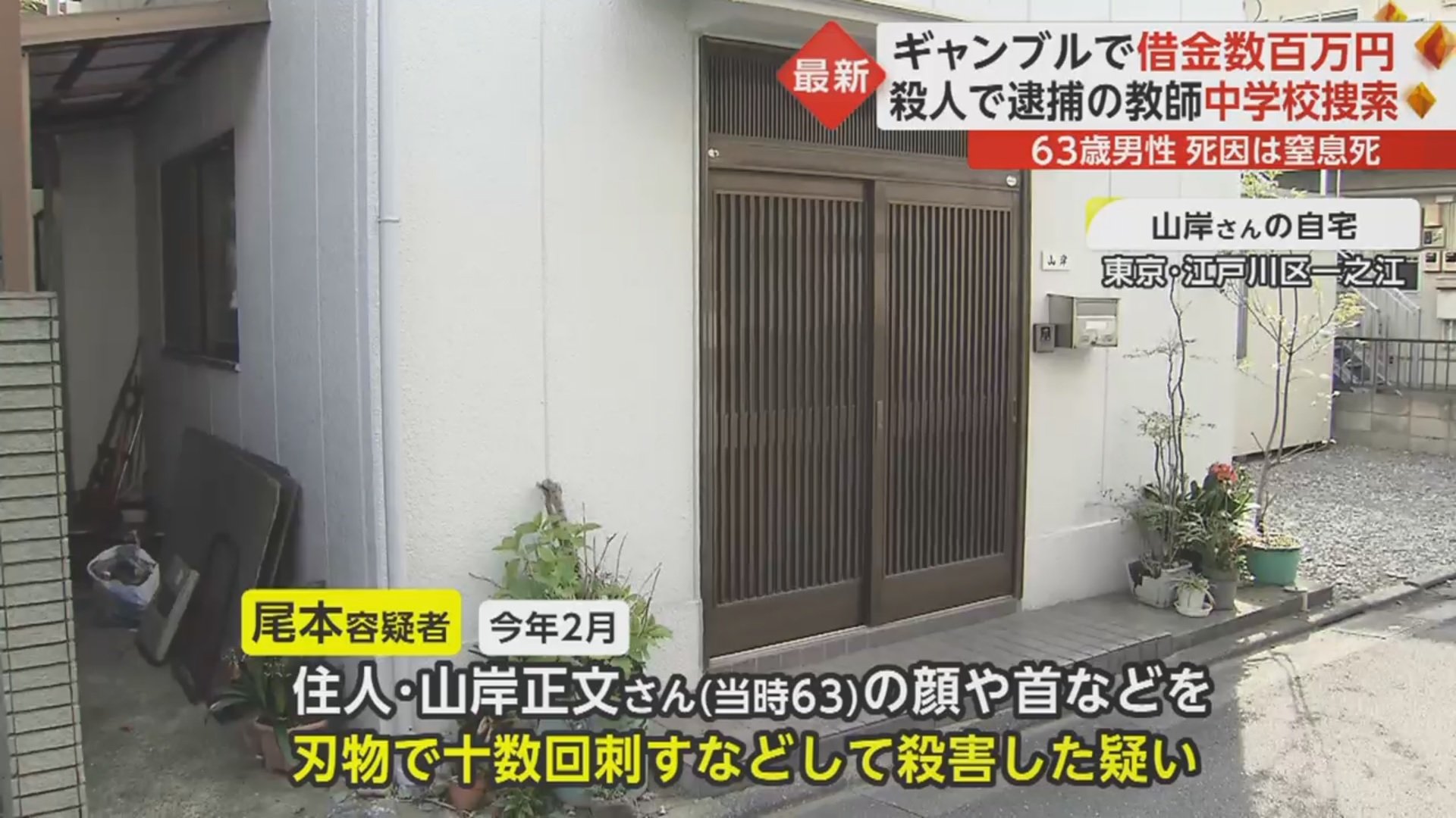 尾本容疑者は今年2月、江戸川区一之江の住宅で、この家に住む山岸正文さん(当時63)の顔や首などを刃物で十数回刺すなどして殺害した疑いが持たれている。