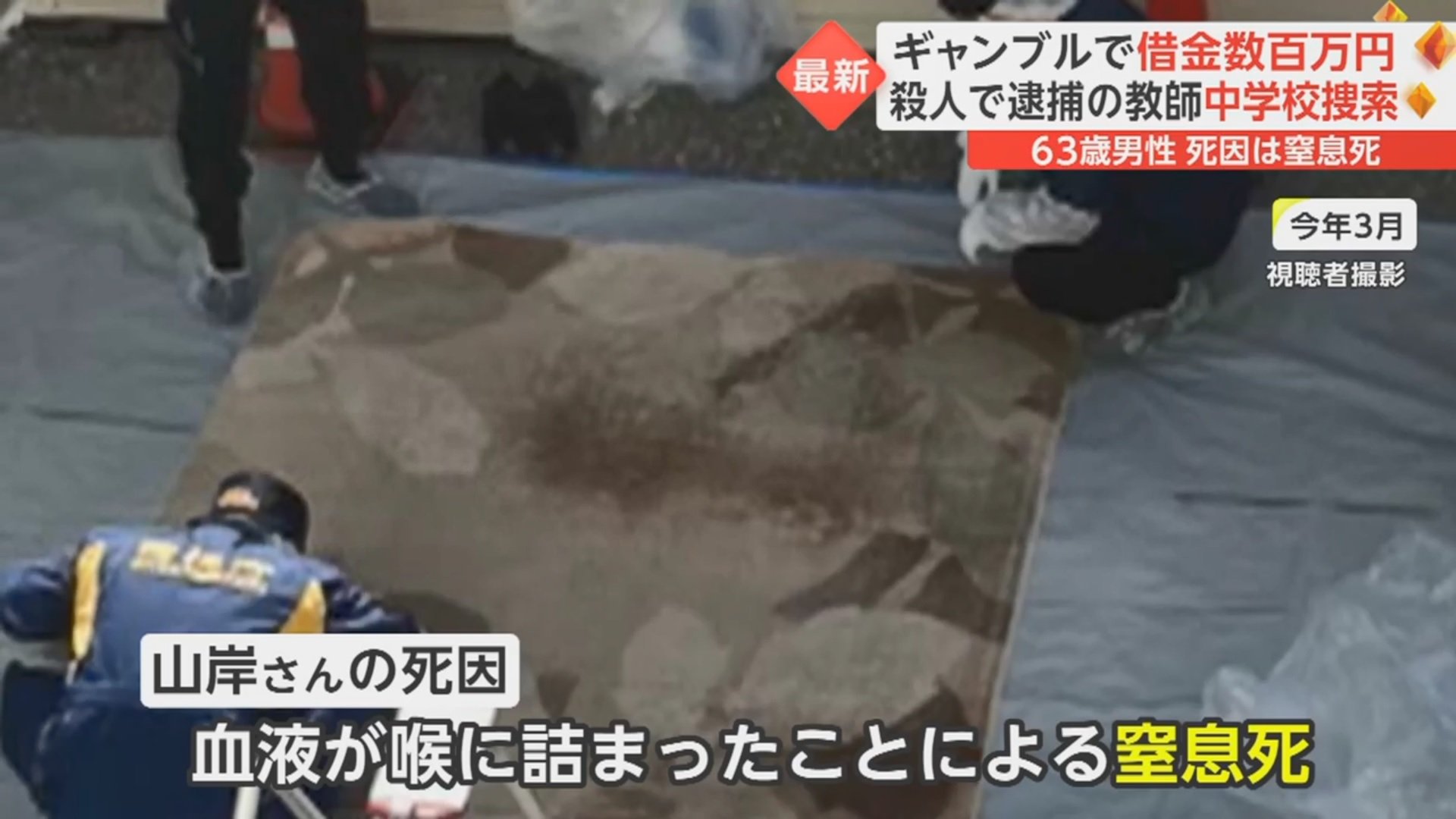 事件後、山岸さんの自宅前で現場検証する様子を近隣住民が撮影した画像には、ブルーシートの上に置かれたカーペットに血のようなものが付着している様子が映っていた。