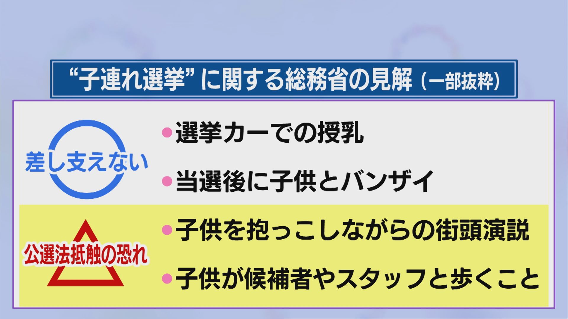 そこでは、「選挙カーでの授乳」や「当選後に子供とバンザイ」をすることなどは“差し支えない”とされたが、「子供を抱っこしながらの街頭演説」や「子供が候補者やスタッフと歩くこと」などは、投票を働きかけた場合、“公職選挙法に抵触する恐れがある”とされている。