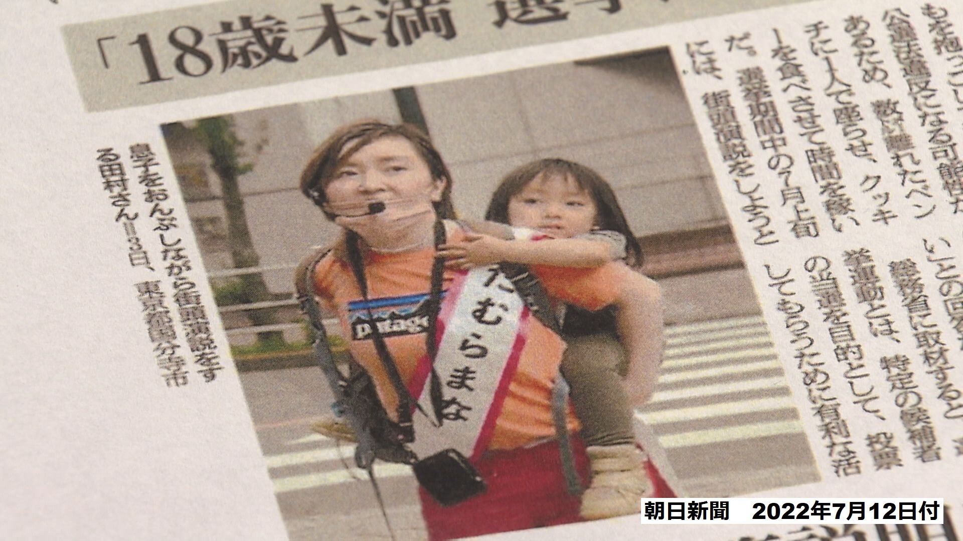 選挙期間中に(子供が)疲れて降りたくない、みたいになっちゃって、おんぶで演説している写真を朝日新聞さんが記事にして。「(選挙)違反だ」という声を多くいただいて