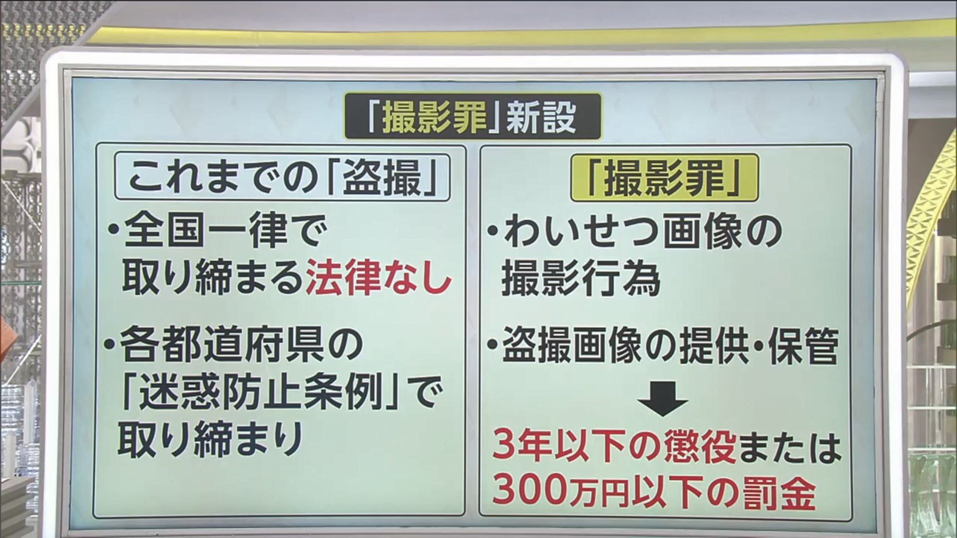 これまでは盗撮を全国一律で取り締まる法律はなく、各都道府県の迷惑防止条例等で取り締まってきた。今回新設された撮影罪では、わいせつな画像を撮影する行為のほか、盗撮画像の提供や保管も処罰対象になり、3年以下の懲役、または300万円以下の罰金が科せられる。
