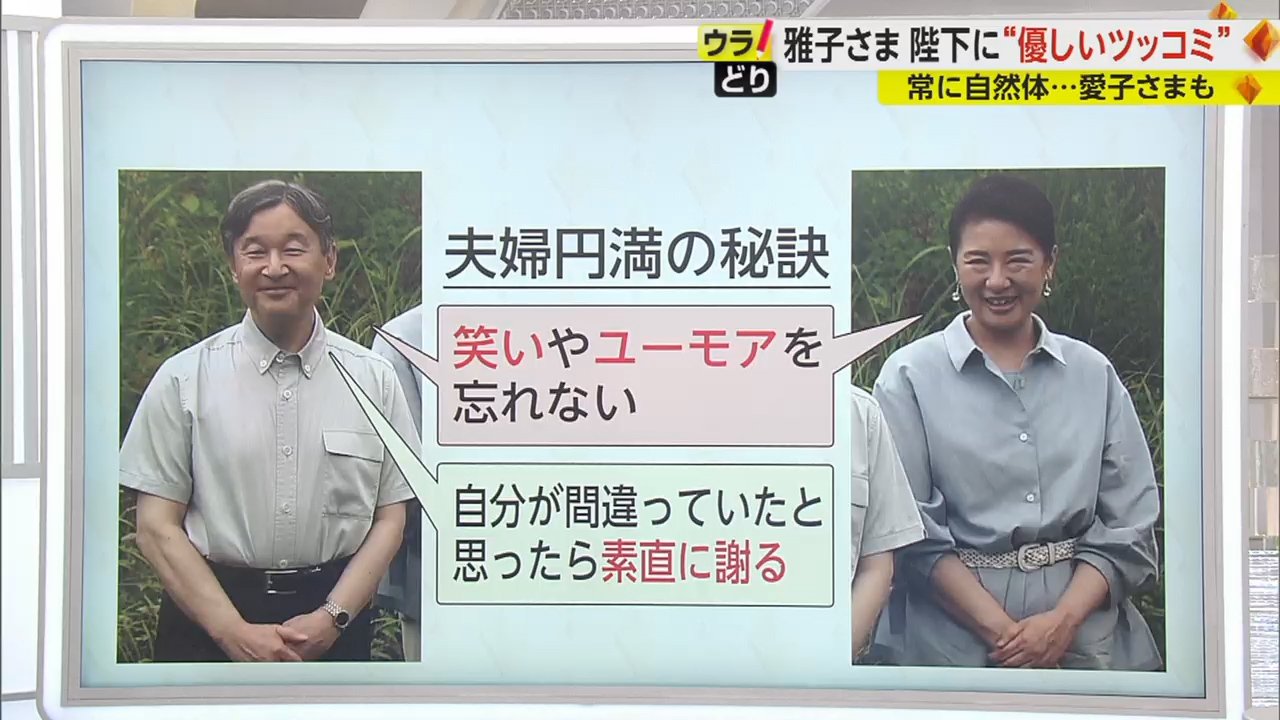 6月に結婚30年を迎えられた両陛下は、これまで夫婦円満の秘訣として共に「笑いやユーモアを忘れない」こと、さらに陛下は「自分が間違っていたと思ったら素直に謝る」ことを心がけてこられたという。
