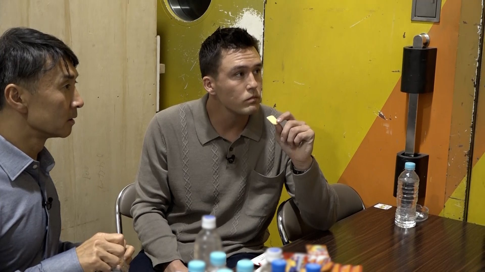 打ち合わせが始まると、番組内容を説明するスタッフの目を見つめて真剣に話を聞きながらも、手元では「せんべい」の包装紙を細かく折りたたんで綺麗に結ぶという、日本人でもなかなかやらないような手先の器用さを見せた。