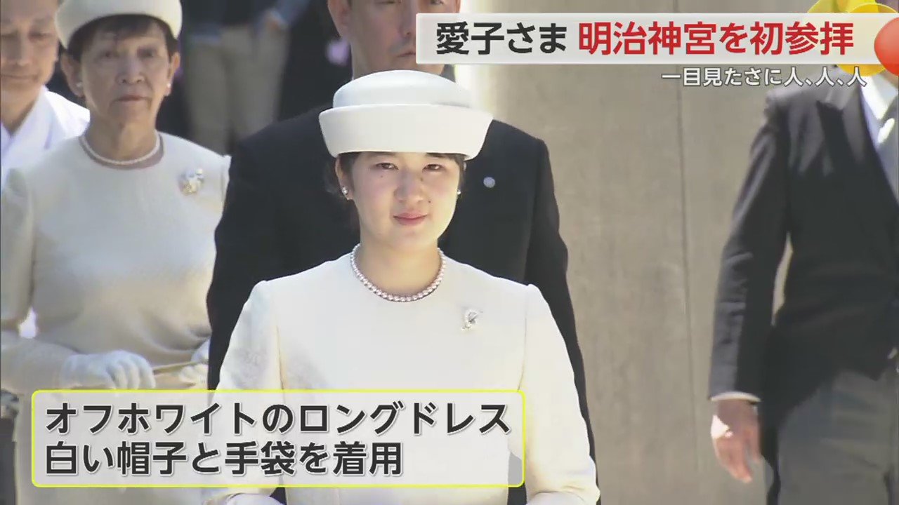 愛子さまは、参拝用のオフホワイトのロングドレスに、白い帽子と手袋を着用し、扇子を手に、ゆっくりと石畳を進まれた。