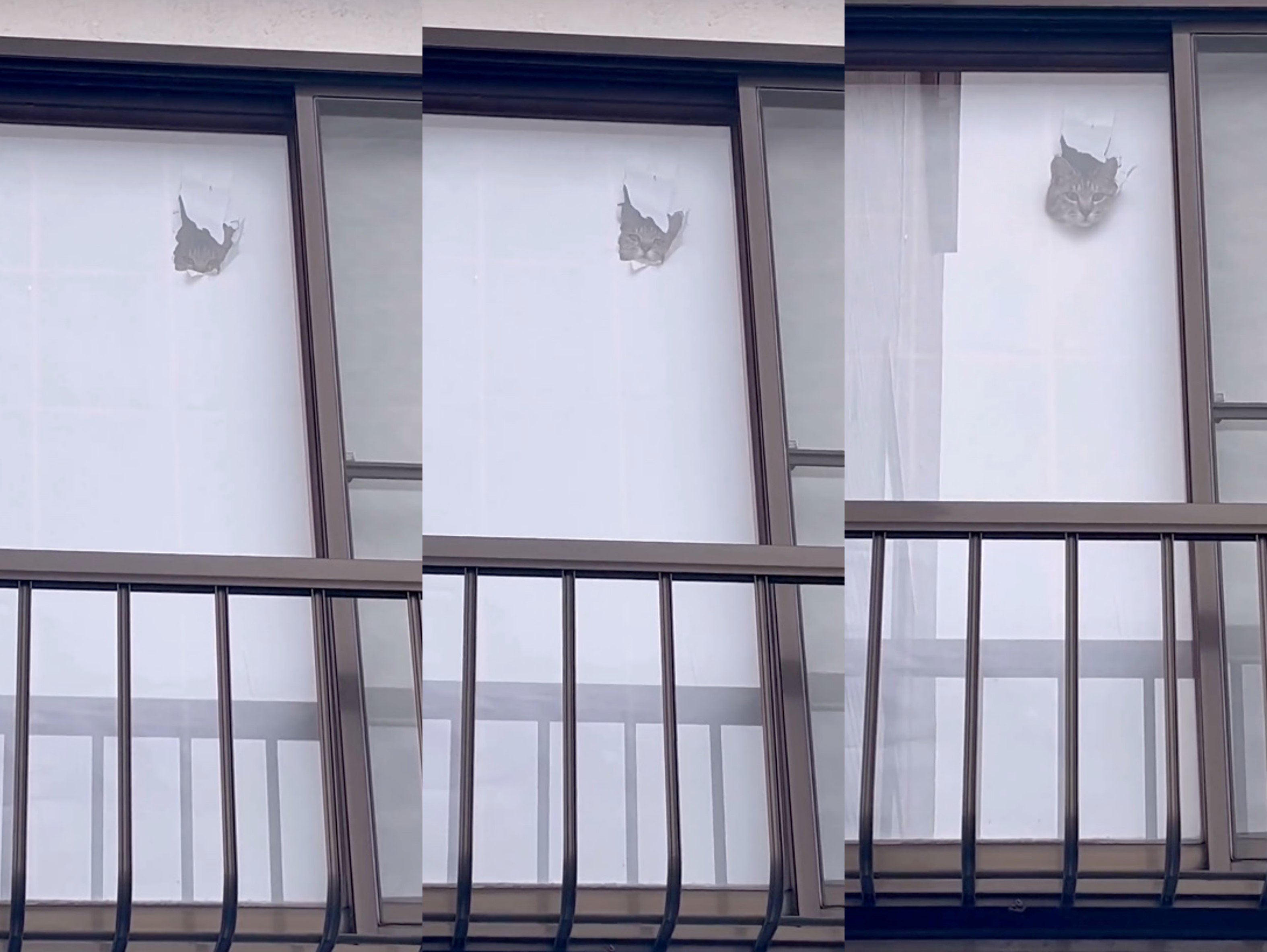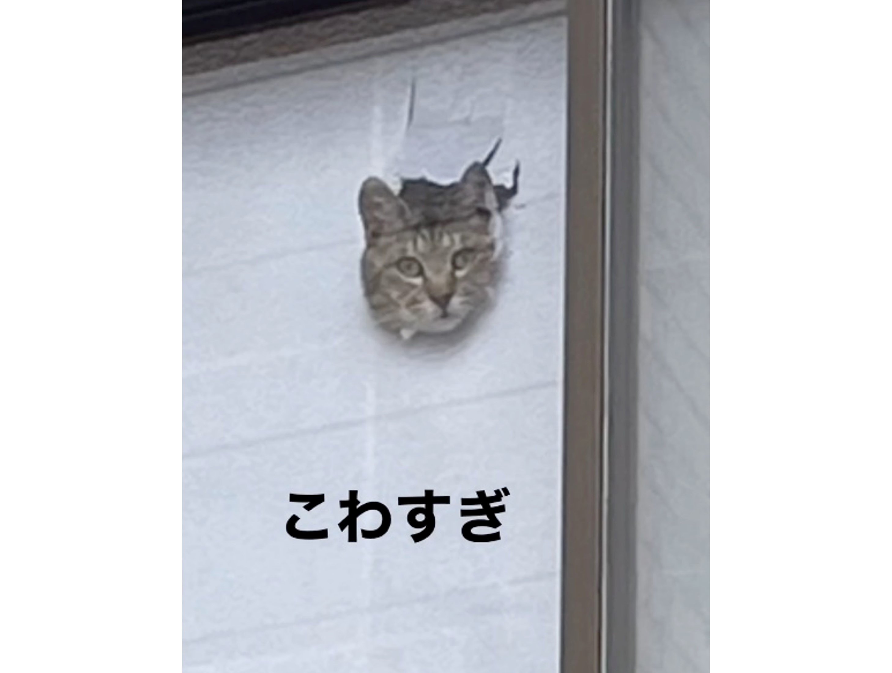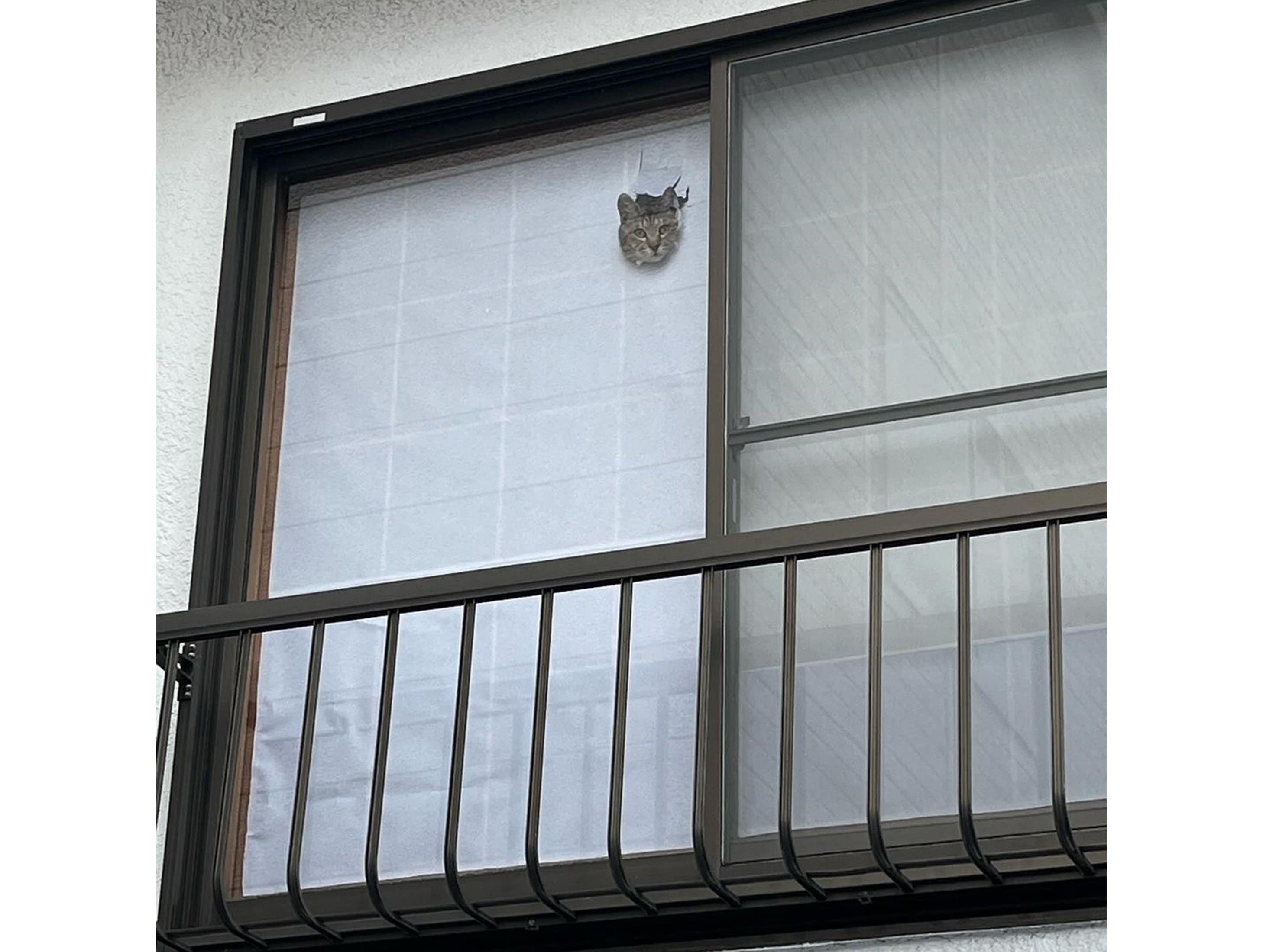よく猫たちがじゃれて穴を開けるのですが(貼り替えたばかりでした)、この穴はおそらく写真の子ではない子があけて、そこから顔を入れたことで穴が広がったんだと思います。