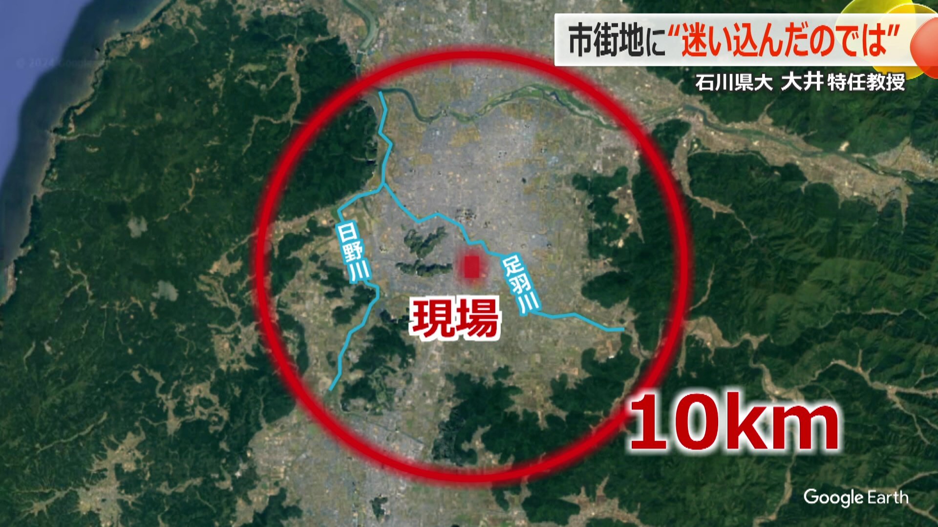 クマが居座った現場となった住宅街の東側には足羽川、西側には日野川が流れていて、10km圏内にはクマが生息する山地がある。
