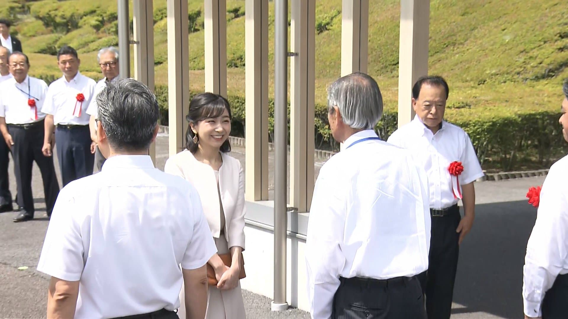 7月25日午前10時過ぎ、御殿場市の勝又正美 市長や静岡県の鈴木康友 知事、静岡県議会の落合慎悟 議長などに出迎えられる中、薄いベージュのワンピースにアイボリーのノーカラージャケット姿で御殿場市馬術・スポーツセンターに到着された佳子さま。