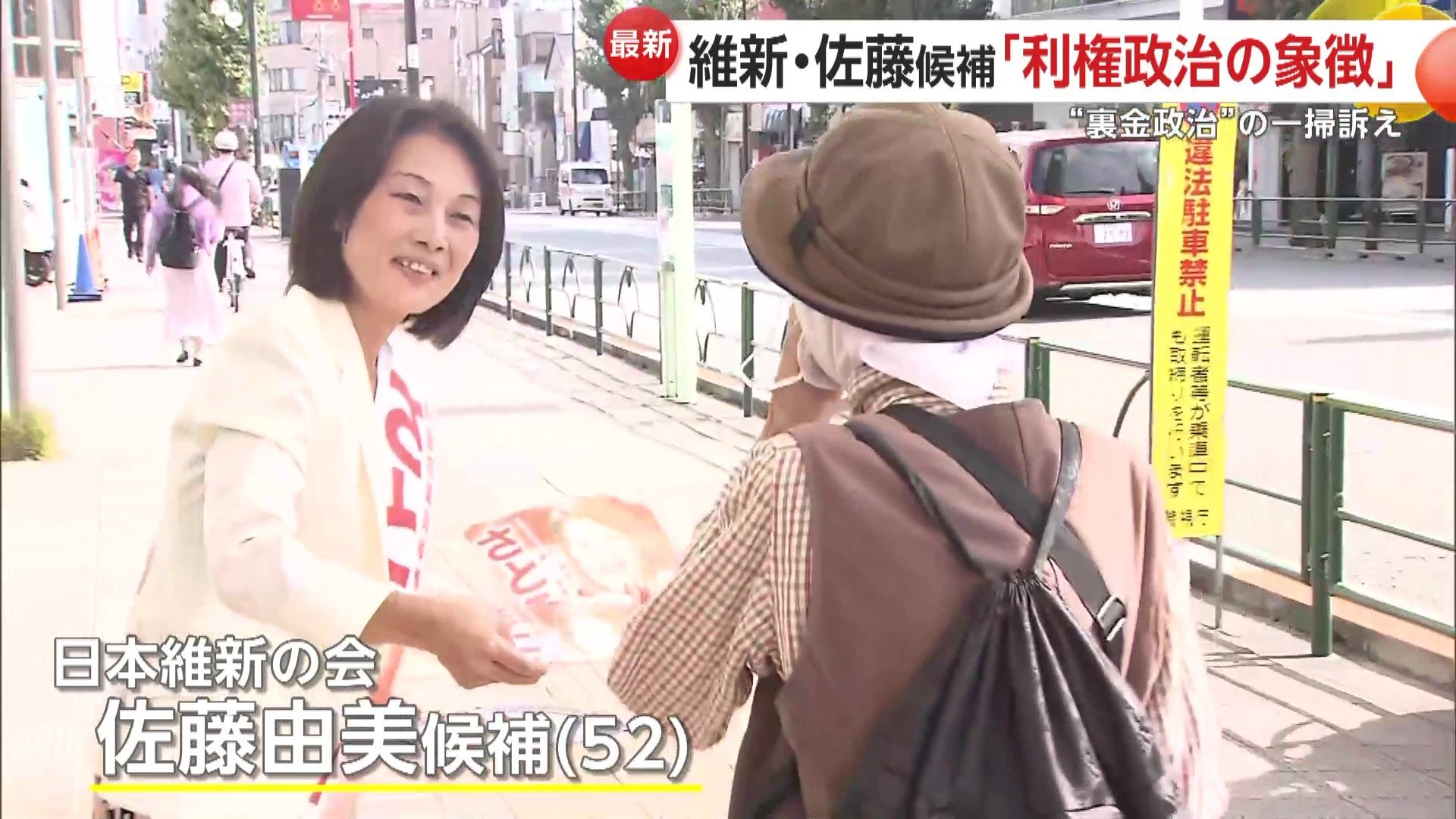 政治とカネ問題を追及する候補は他にもいた。道行く人に自らビラ配りを行う、日本維新の会公認の佐藤由美候補だ。