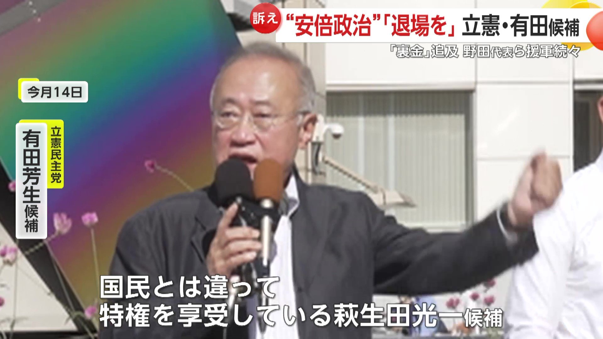 有田候補はアベノミクスの失敗に加え、収支報告書の不記載問題など、安倍政治とそれに関わる政治家らが日本にマイナスをもたらしたと訴える。