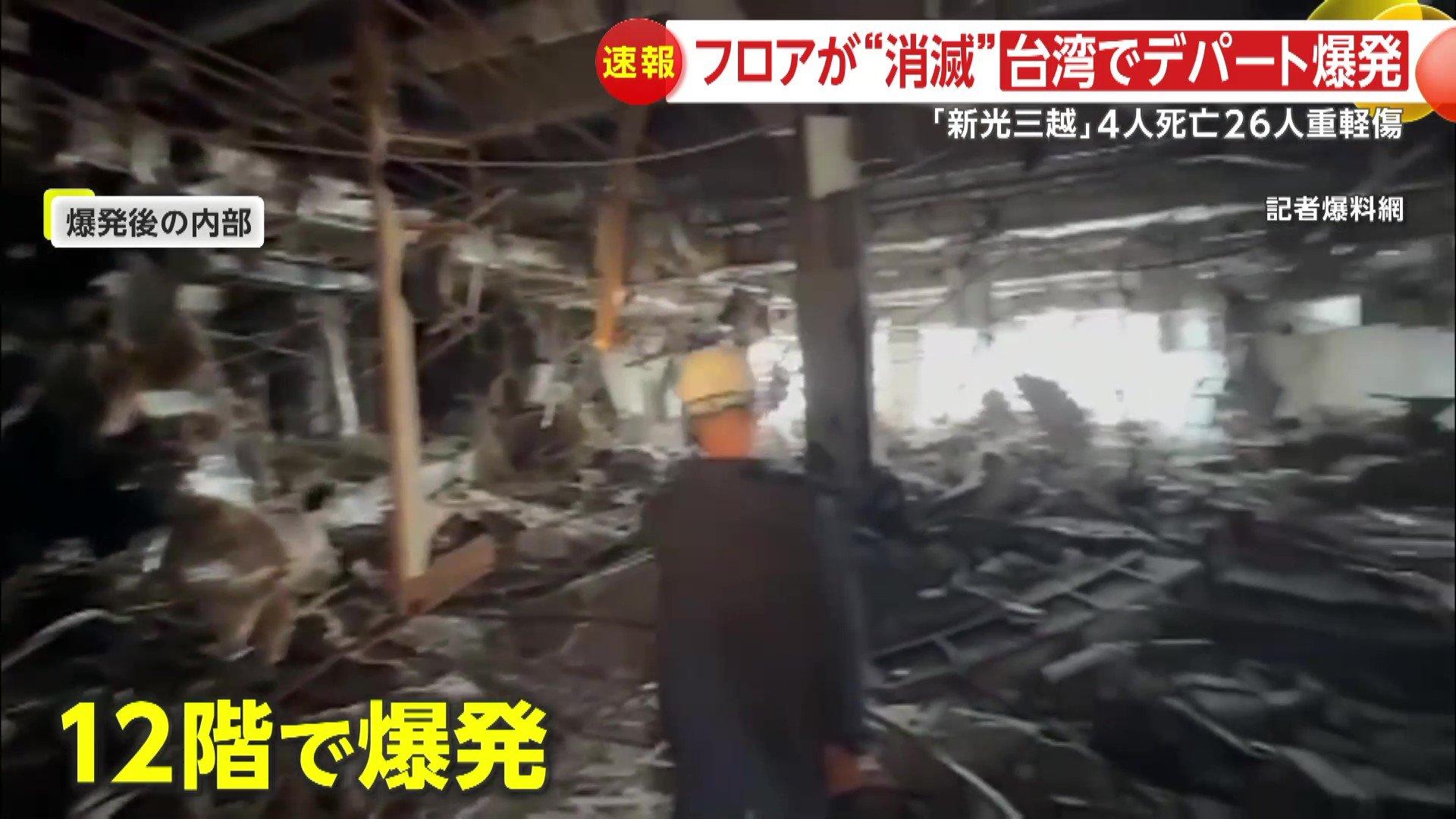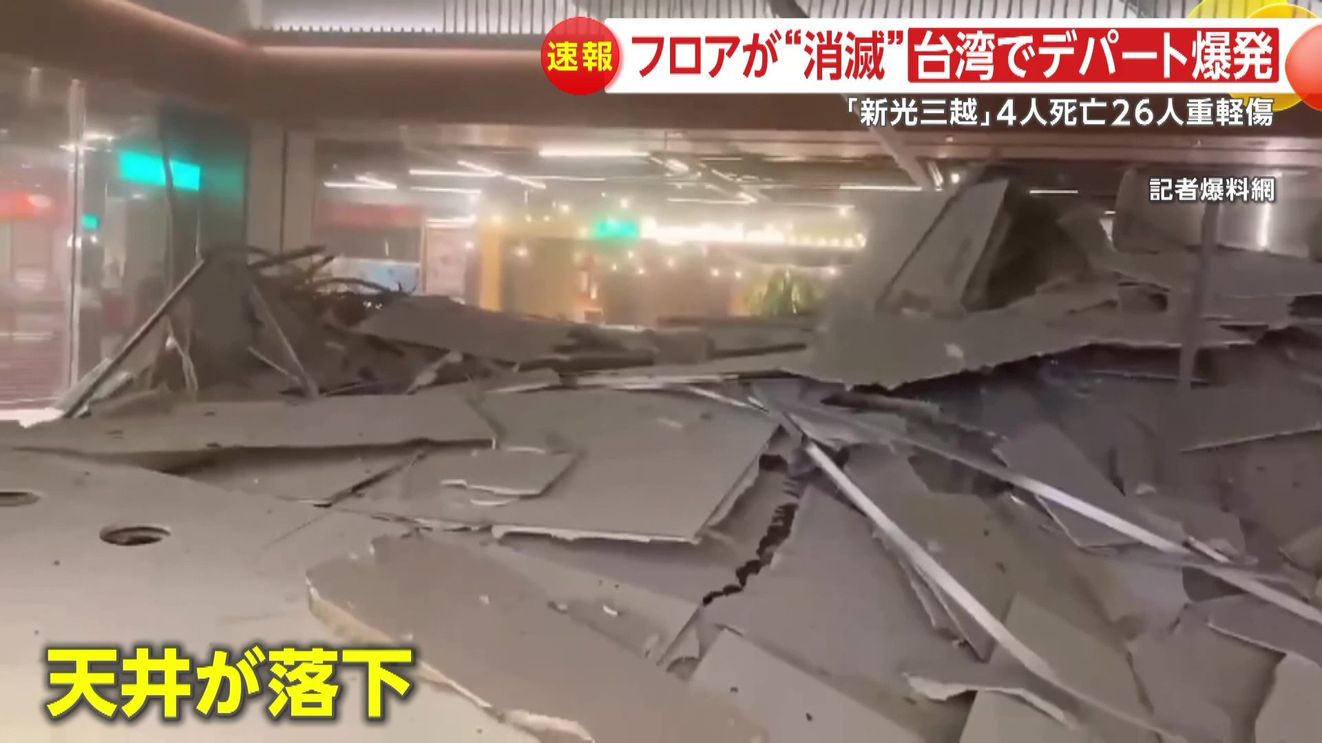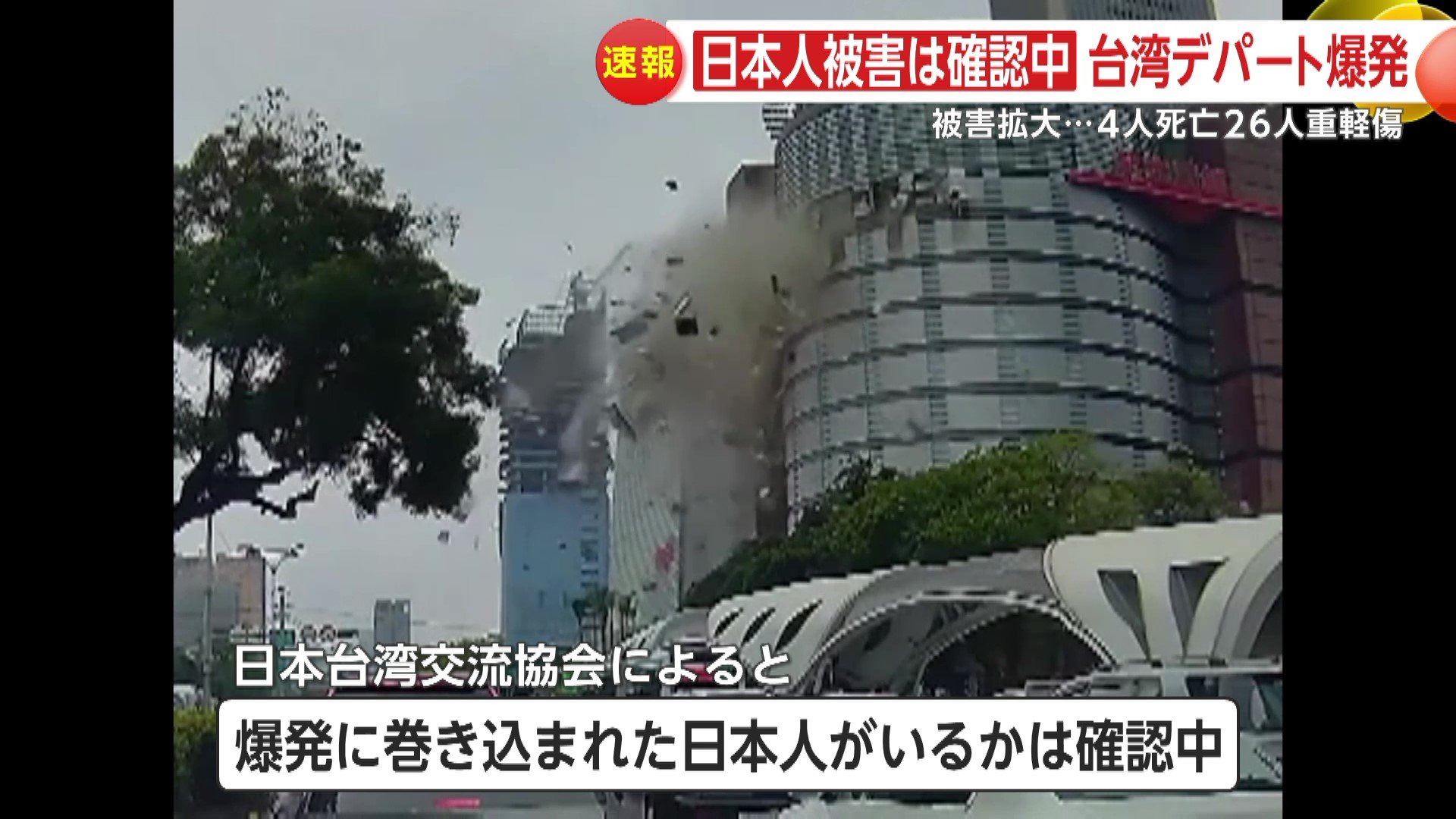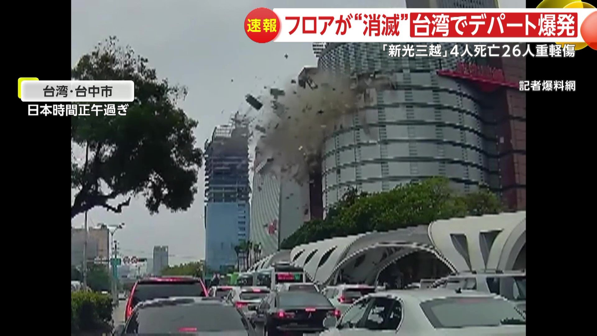日本時間の13日、台湾中部にあるデパートで爆発が起こった。消防によると、これまでに4人が死亡し、26人が重軽傷を負ったという。巻き込まれた日本人がいるかどうかは確認中としている。爆発の瞬間を捉えた映像には、建物の上層階の外壁が飛び散り、下に落下していく様子が映っていたーー。