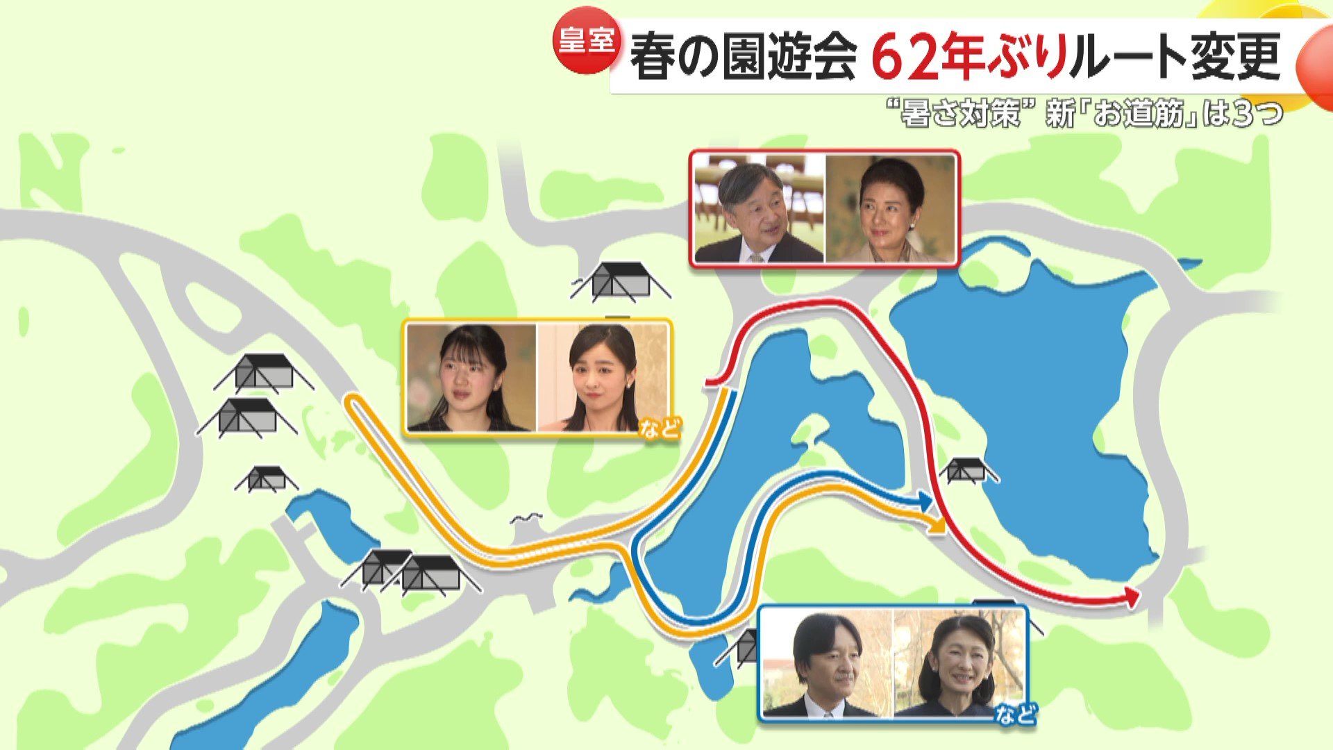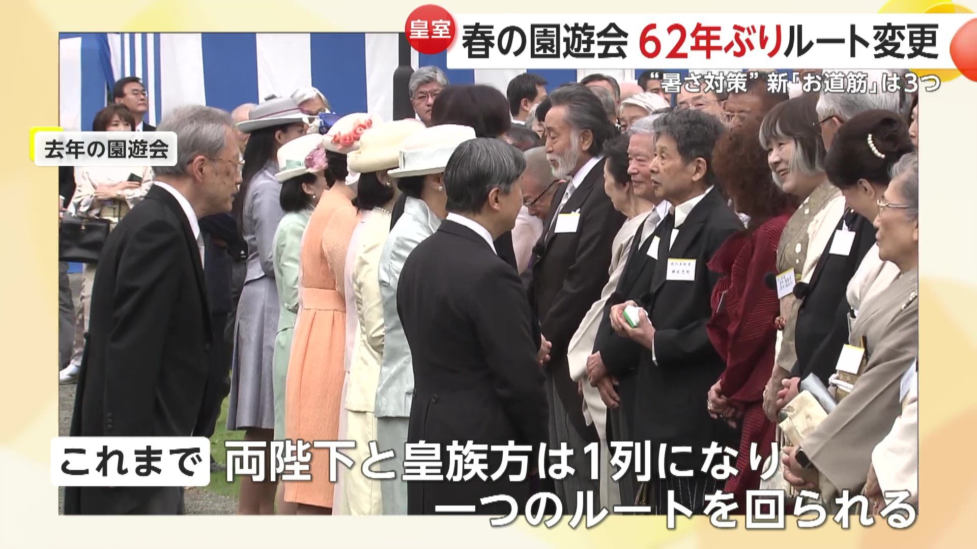 今回の園遊会では、「お道筋(みちすじ)」と呼ばれる皇族方が通るルートが、62年ぶりに変更された。新しい「お道筋」は3つ。