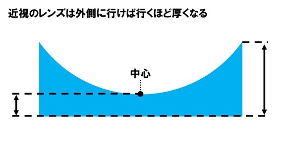 「日本人の『眼が悪い人』のほとんどは近視ですが、近視のレンズは中心がもっとも薄く、端にいくに従って分厚くなる形状です。この形状のレンズは、全体が厚くなるほど中心の目を小さく見せる性質が強くなります。そしてレンズ全体の厚さは、横幅が広くなるほど増していくため、横幅が広いメガネだと目がより小さく見えてしまうのです」
