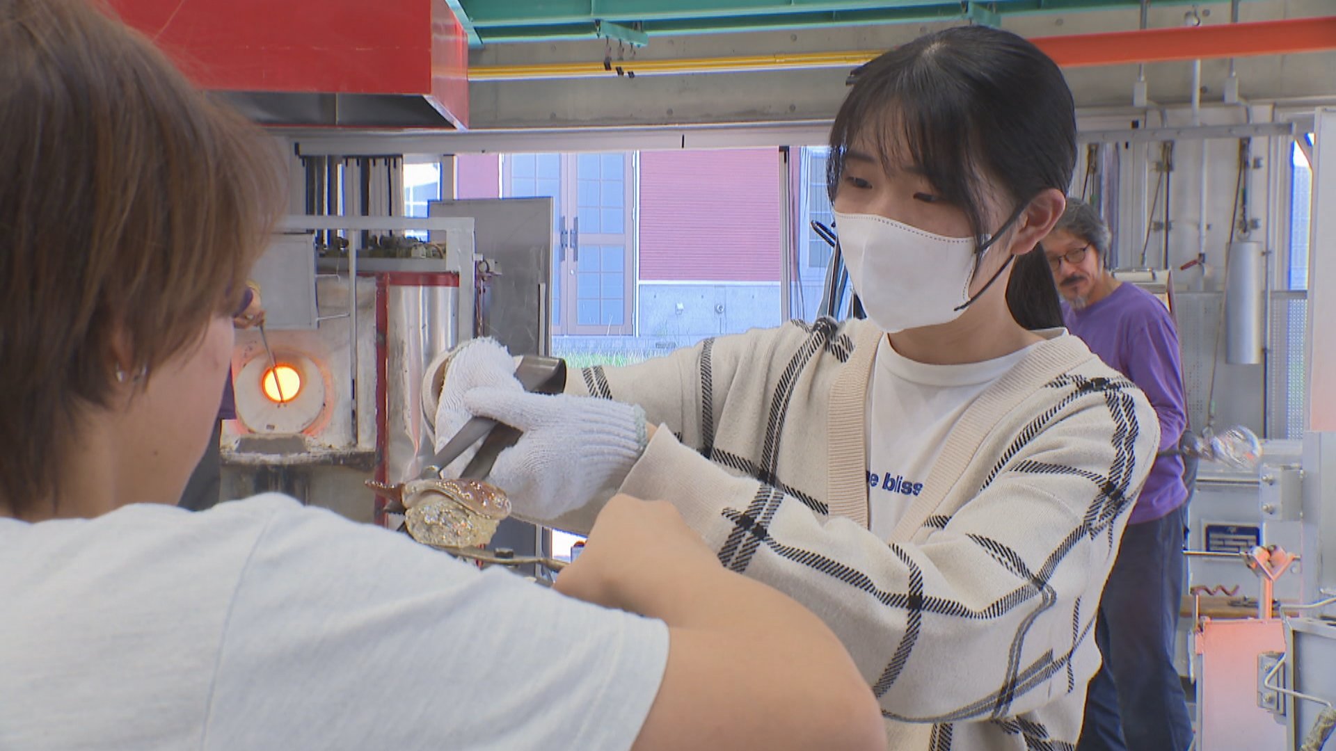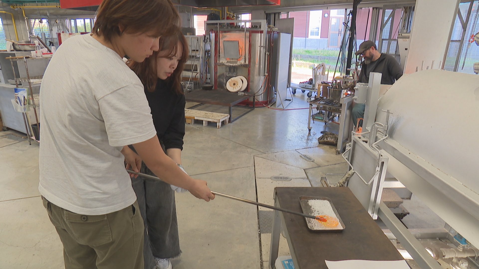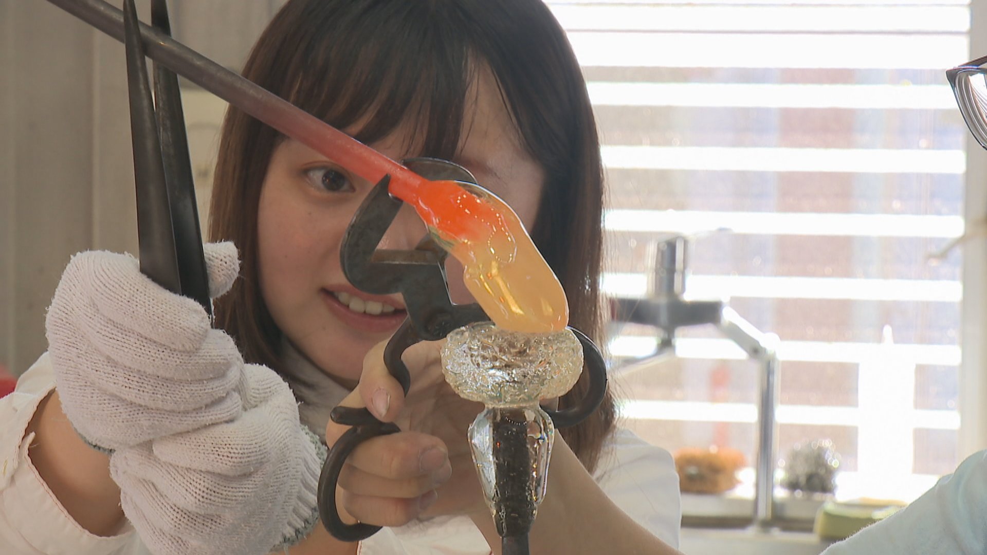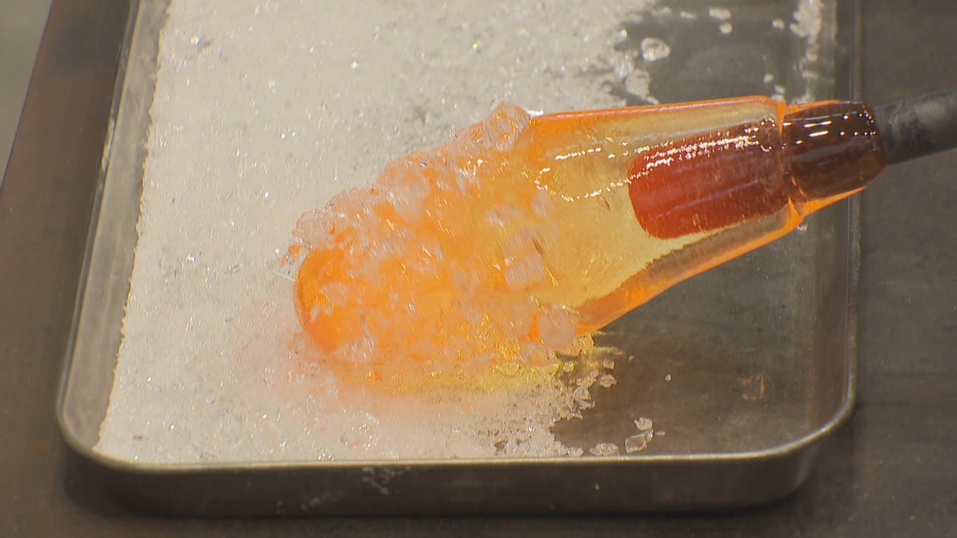 体験はまず約1300度の溶解炉から透明なガラスを取り出し、シャリの形に整えるところから始まる。ごはん粒の表現には溶けたガラスに小さなガラス粒をつける工夫が施されている。