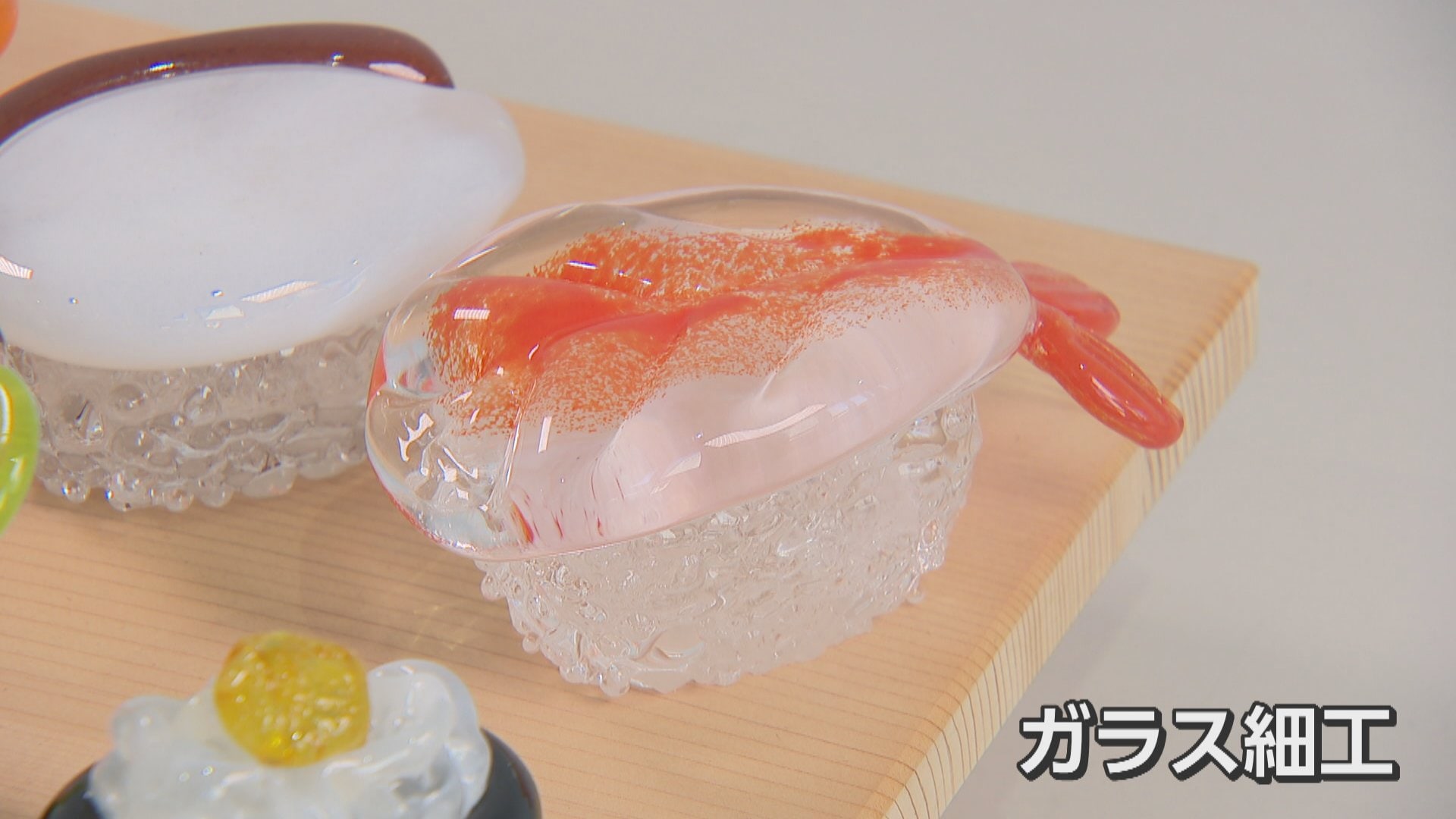 「ガラス寿司」作りを体験する吉國アナ(中央)