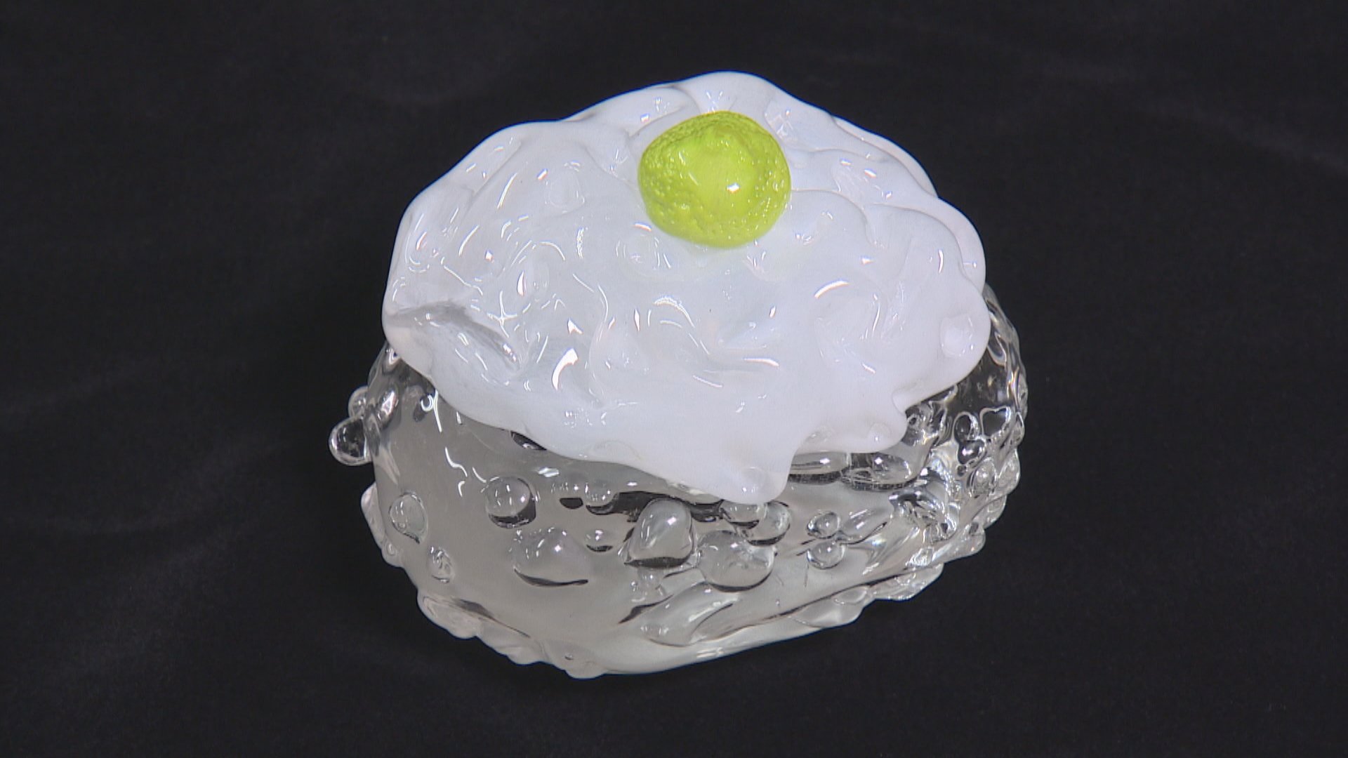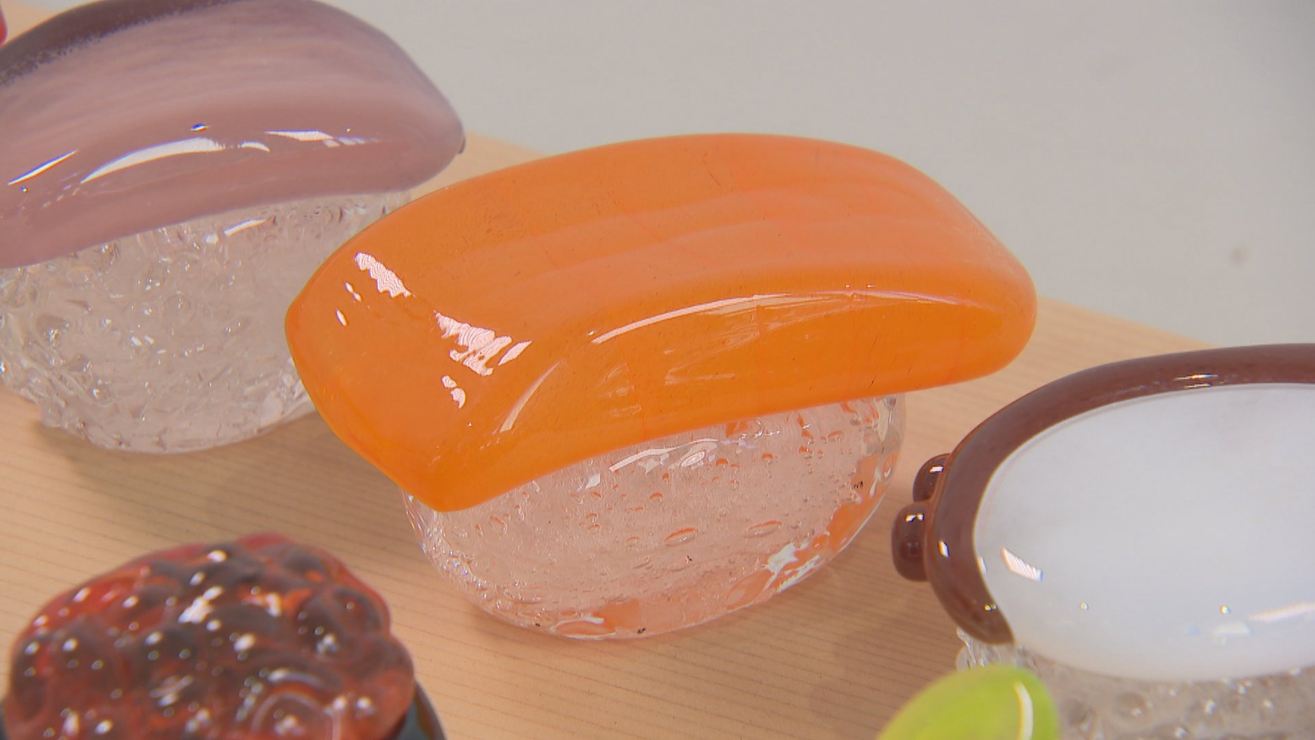 次にネタとなる部分を作るため、再び透明なガラスを取り出し、色ガラスの粉をつけて形を整える。最後にネタとシャリを重ね、ワサビを乗せれば完成だ。