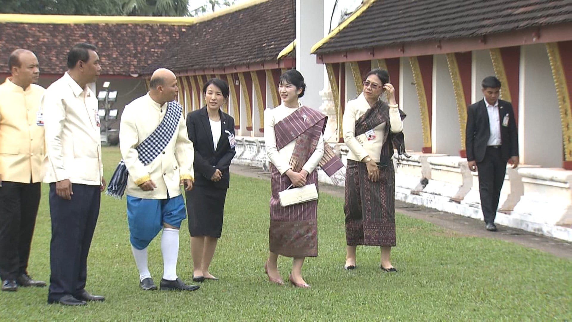 現地日程の初日、ラオスで最も格式が高いとされる仏塔「タートルアン」の前でご到着を待っていると、小豆色の肩掛け「パービアン」や巻きスカート「シン」を身にまとう愛子さまのお姿が見えた。