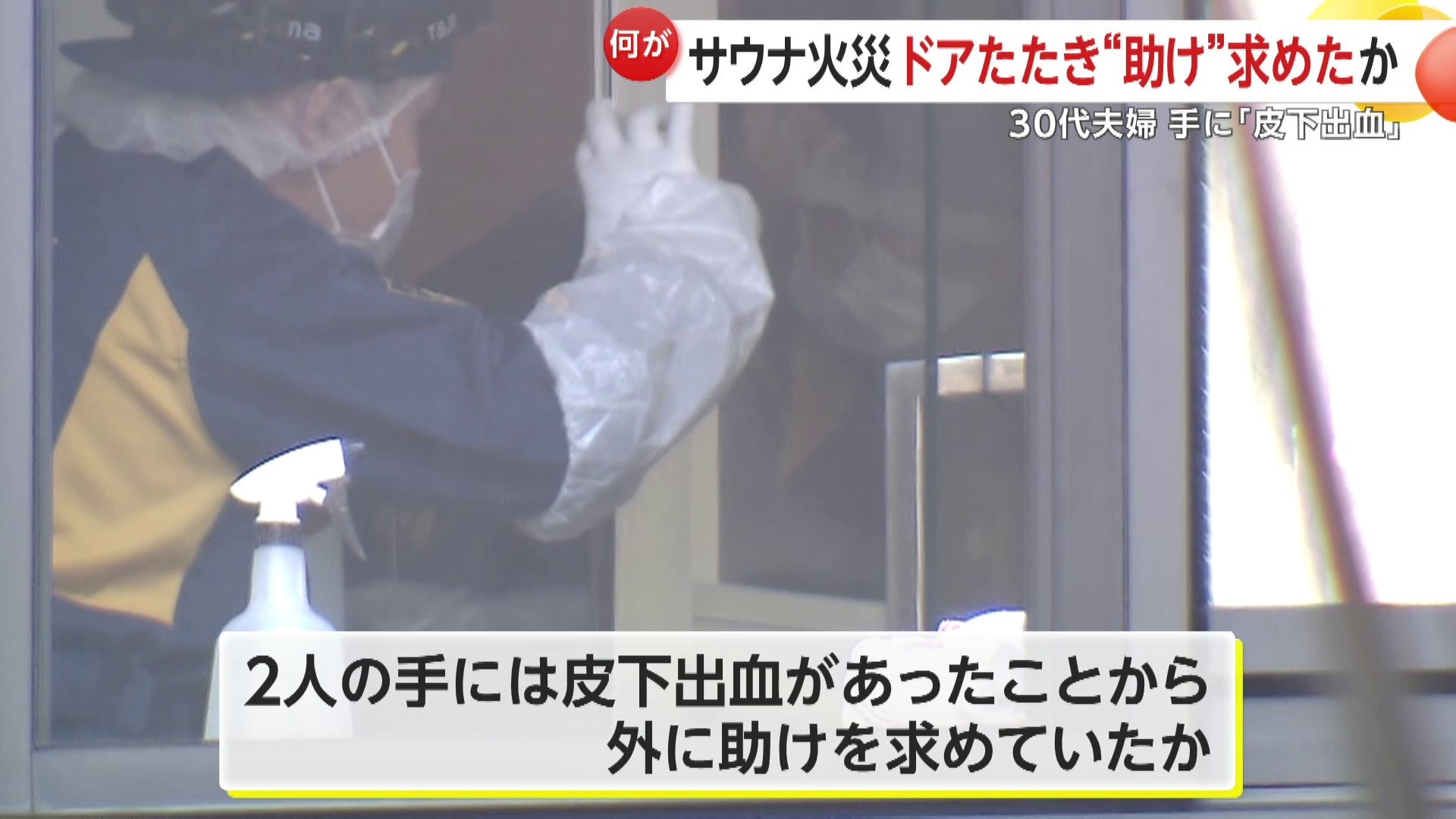 東京・赤坂の個室サウナで30代の夫婦が死亡した火事で、ドアには叩いたような跡があったほか、2人の手には皮下出血があったことがわかった。