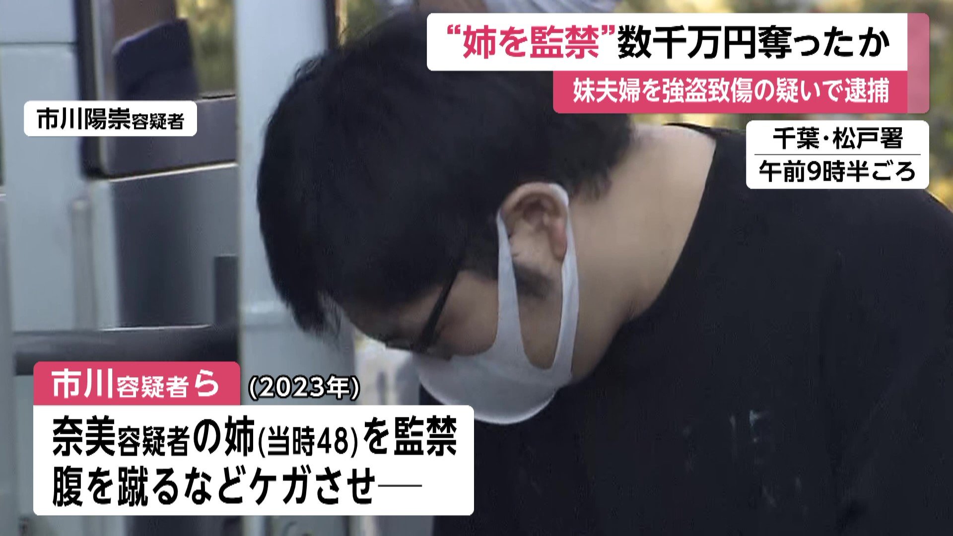 市川陽崇容疑者と妻の奈美容疑者は2023年、松戸市横須賀の自宅に奈美容疑者の姉を監禁し、腹を蹴るなどしてケガをさせたうえ、金銭を奪おうとした監禁と強盗致傷の疑いがもたれている。