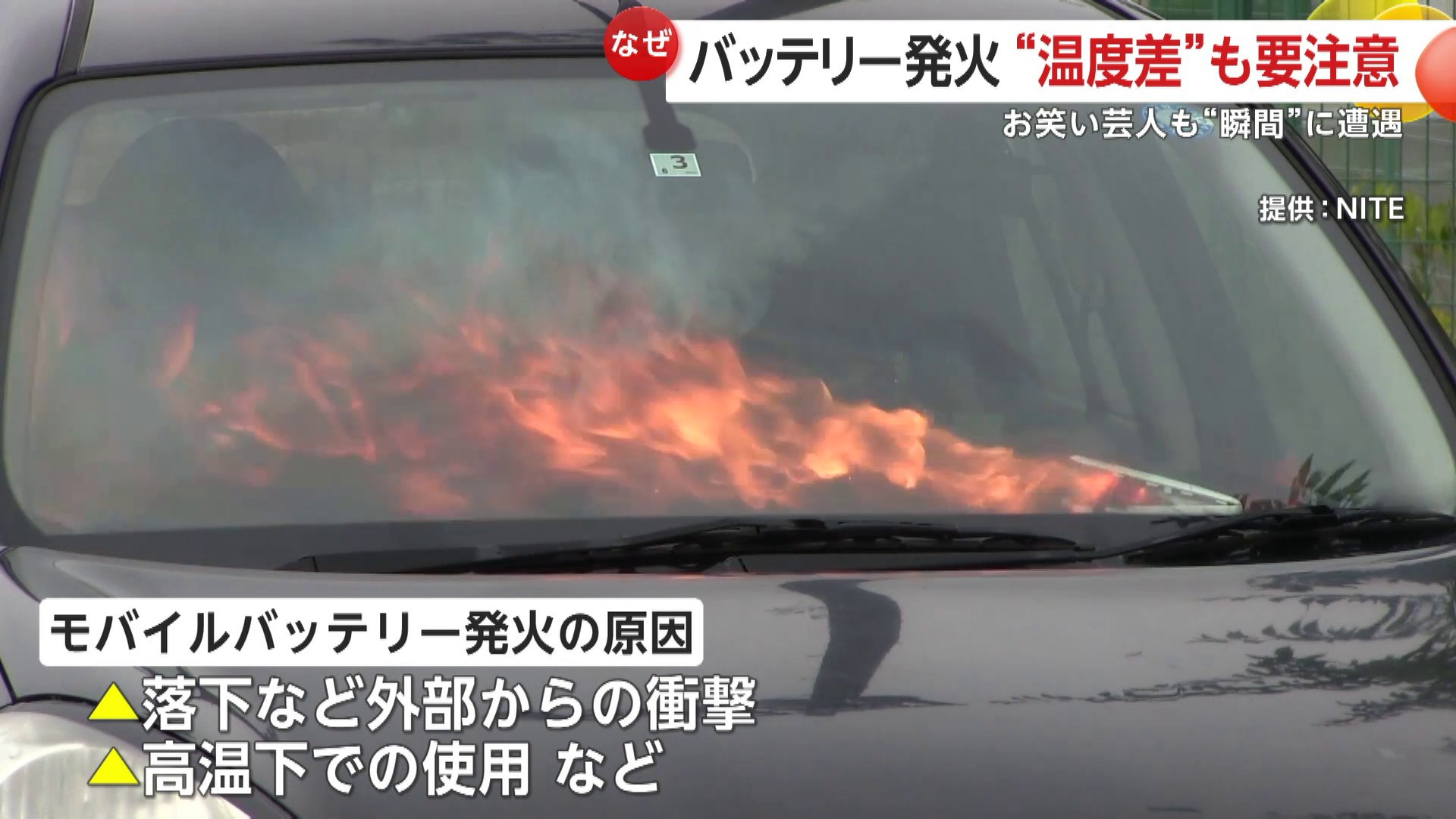 例えばストーブの前やファンヒーターの風、熱い風が出てくるところ、そういったところに置いて使ったり、充電したりすると、最終的に発火のリスクが高まる。