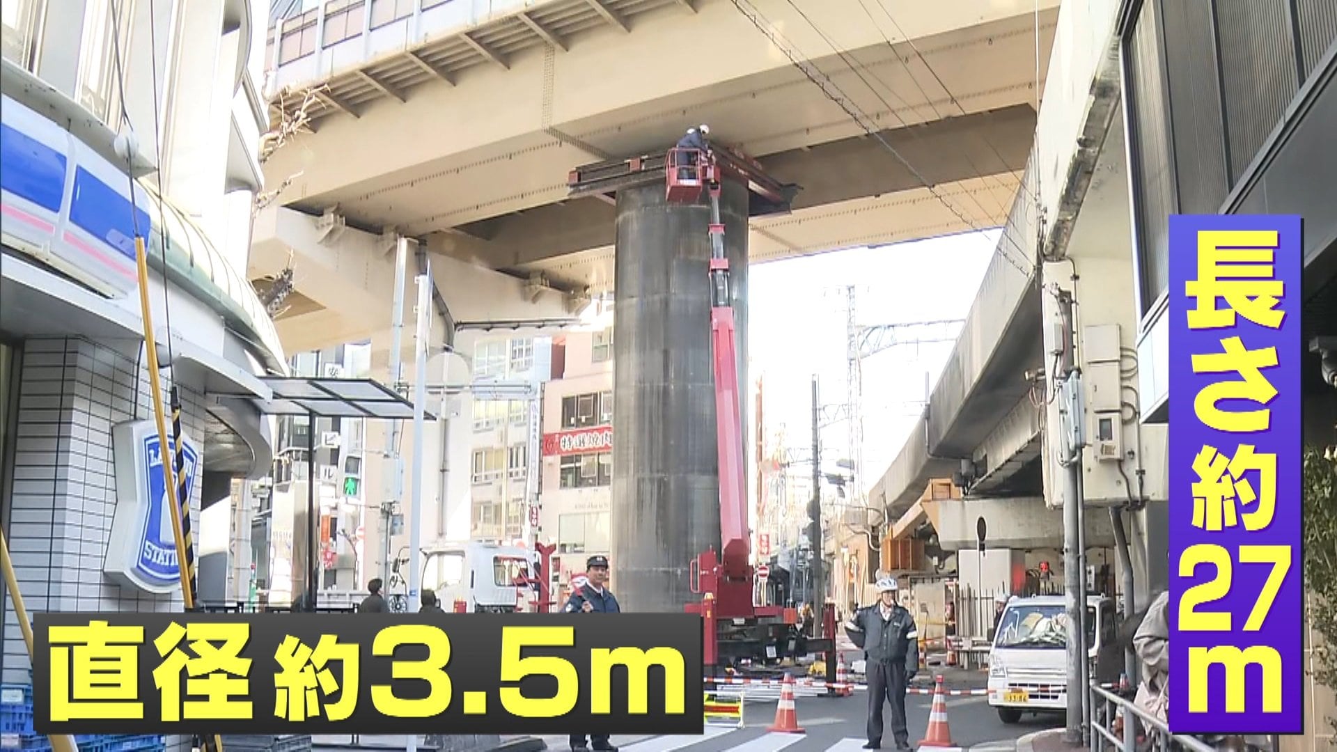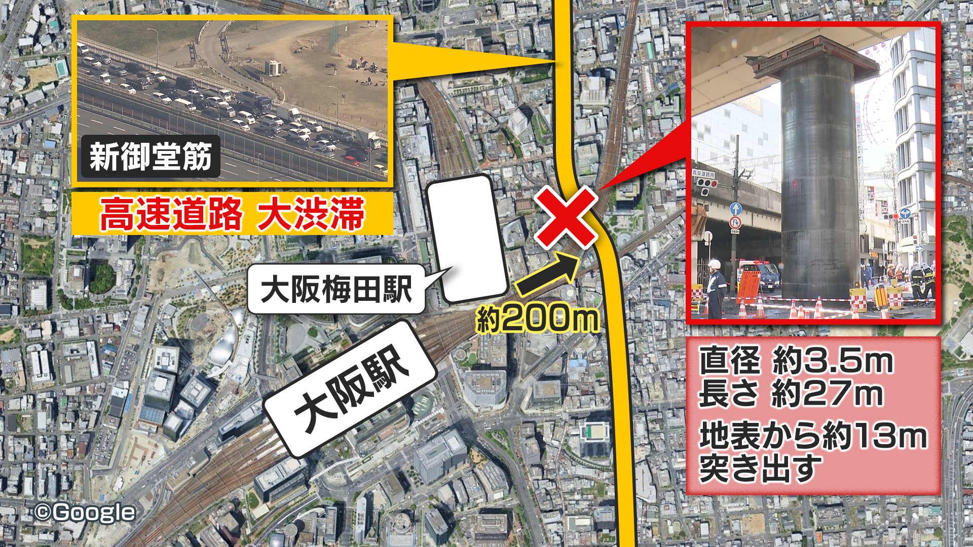 11日午前7時ごろ突然、大阪市北区・新御堂筋の高架下で、巨大な鋼鉄製のパイプが地中から“せり上がって”出現しました。