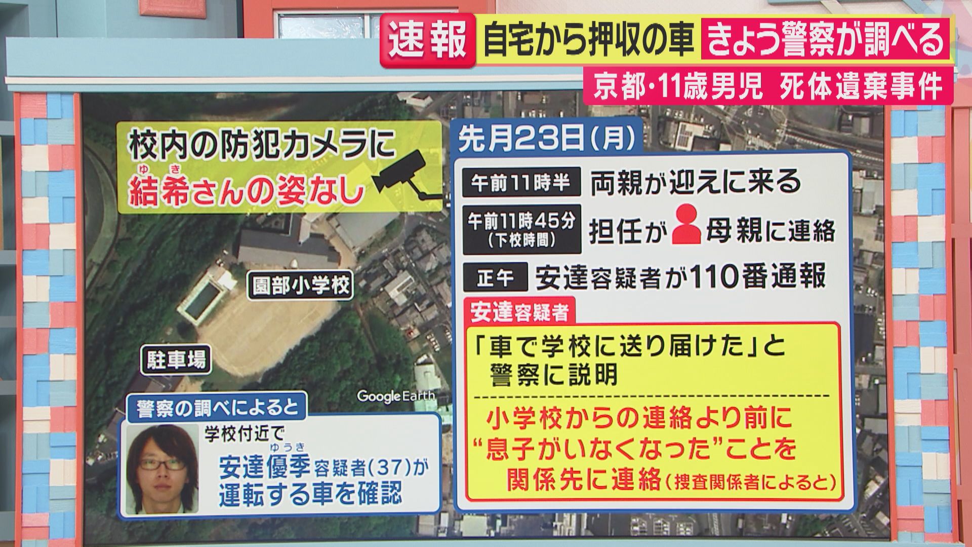 ・正午:安達容疑者が110番通報し「車で学校に送り届けた」と説明