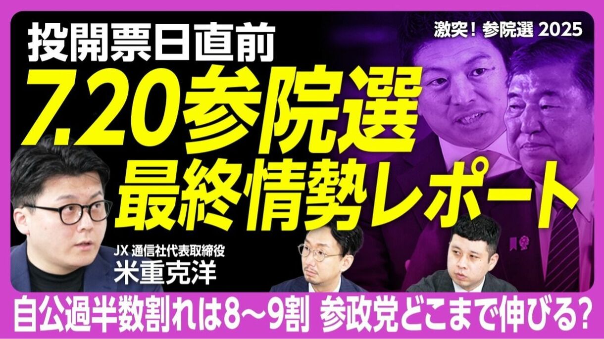 今回の「激突!参院選2025」、ゲストは選挙の情勢調査を得意とする、JX通信社代表取締役の米重克洋さんです。参院選終盤となり、情勢にはどんな動きが出たのか。厳しい情勢の自民党と公明党、対する立憲民主党をはじめとする野党の勢いは。そして、新興政党である参政党はどこまで議席を伸ばすのか。最新情勢を伺いました。