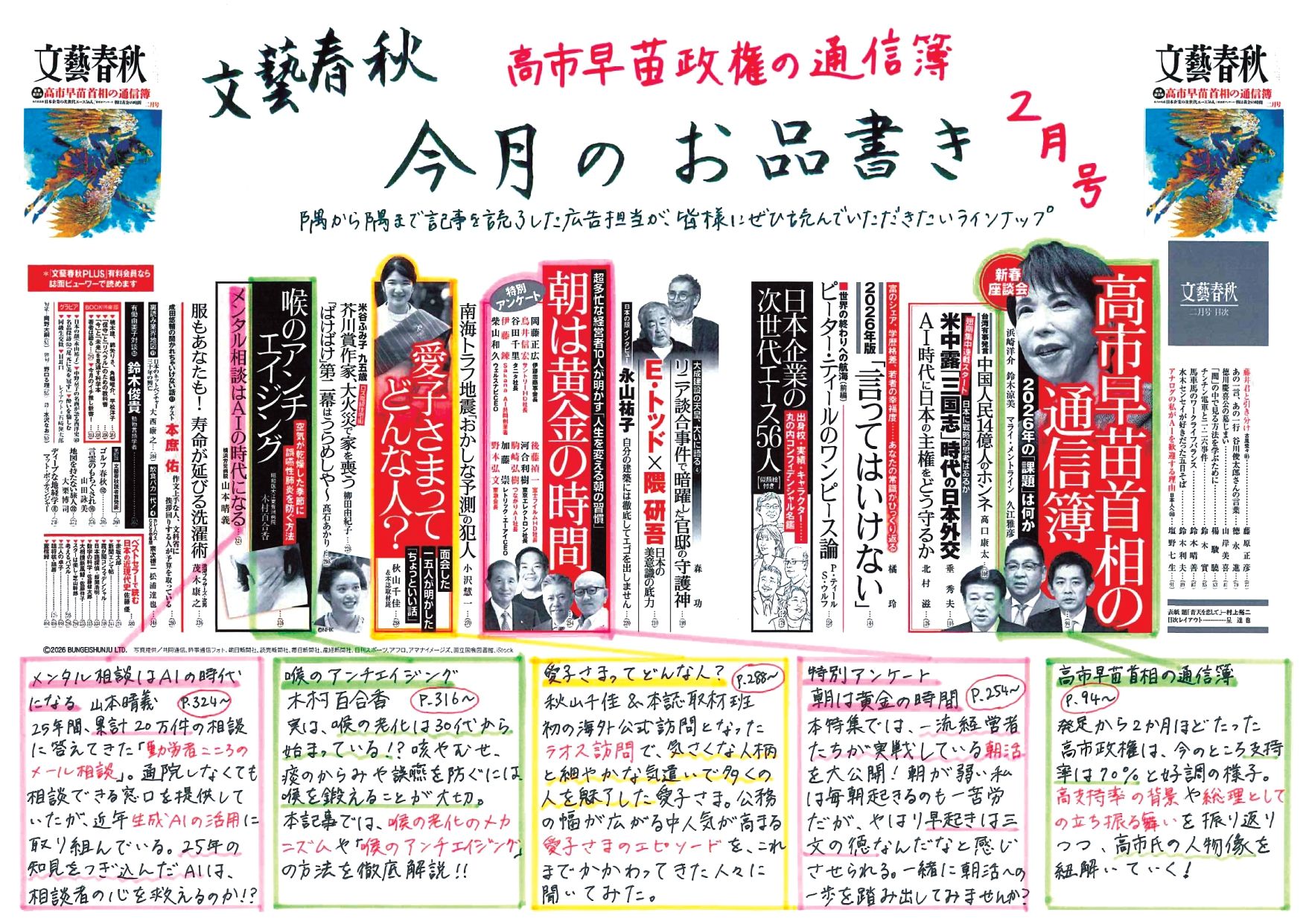 【文藝春秋 目次】新春座談会 高市早苗首相の通信簿/丸の内名鑑 日本企業の次世代エース56人/経営者アンケート 朝は黄金の時間